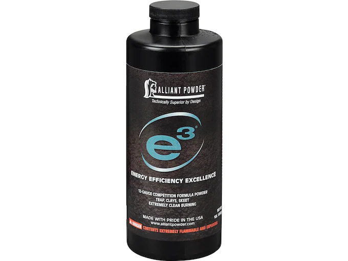 Alliant Powder’s e3 represents the next generation of reloading powder technology, and offers the clay target shooter what he/she needs to maintain the winning edge. This 12 ga powder possesses a perfect balance of the qualities desired by competitive shooters. e3 features reduced charge weights, is the cleanest burning 12 ga. shotshell powder available, and has environmental stability and ultra premium quality to provide more consistent and reproducible performance all-year round. It is destined to become the shot shell powder by which all others are judged. Named after its core qualities of energy, efficiency and excellence, this exciting powder offers 12-gauge target shooters a high-performance product that stands apart from the rest