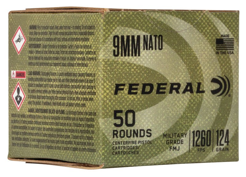 Train harder with ammunition loaded to military specifications. Federal® 9mm NATO features military-quality 124-grain FMJ bullets loaded to more powerful, higher-velocity specifications than rounds typically offered for the consumer market. The ammunition is built to NATO specifications and its sealed case ensures reliable ignition, cycling and ballistics in the harshest conditions.