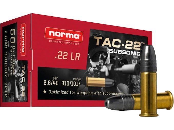 Norma TAC-22 Subsonic Ammunition is a reasonably priced, high quality ammunition mainly for practice, hunting and plinking. The projectile is a 40 grain lead hollow point with a muzzle velocity of 1033 FPS. It shoots consistent tight groupings and offers reliable fast firing energy transfer due hollowpoint regardless the relevant shooting distance. NORMA TAC-22 Subsonic is a perfect match for any suppressed weapon and where low sound emmisions are required.