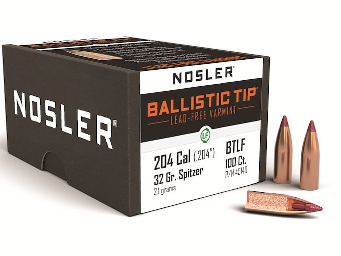Nosler Ballistic Tip Varmint Bullets 20 Caliber (204 Diameter) 32 Grain Spitzer Flat Base Lead-Free Box of 100